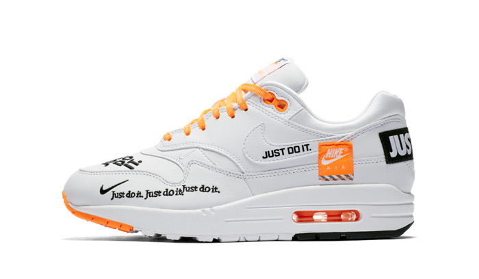 Las Nike Air Max 1 Just Do It vienen en blanco y en naranja, aquí os presentaremos las blancas, el modelo original de 1987 se cubre por multitud de inscripciones, parches y bordados con el slogan just do it, los logos de nike y el swoosh.