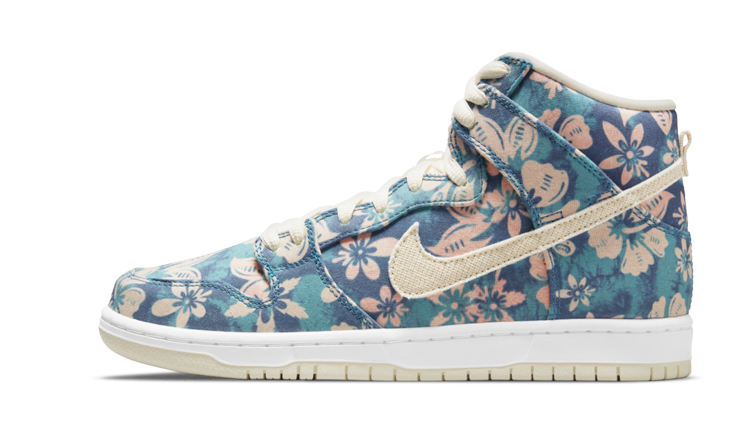 Estas Dunk Hawaii están inspiradas en la isla tropical con un precioso estampado de flores azul turquesa y rosa. Acompañan este patrón toques beige con tanto en la lengüeta como el swoosh y la suela y acaba coronando el diseño una lengüeta naranja brillante. A priori este toque naranja no tiene mucho sentido, pero, espera.